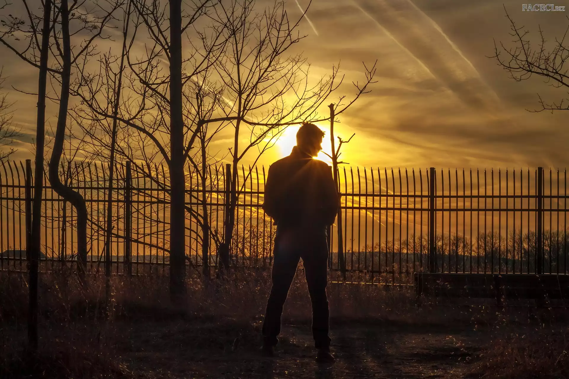 Płot, Drzewa, Mężczyzna, Zachód słońca, Promienie - faceci.biz